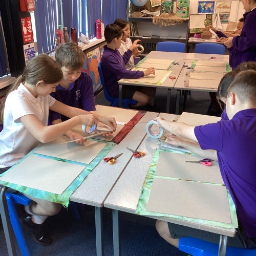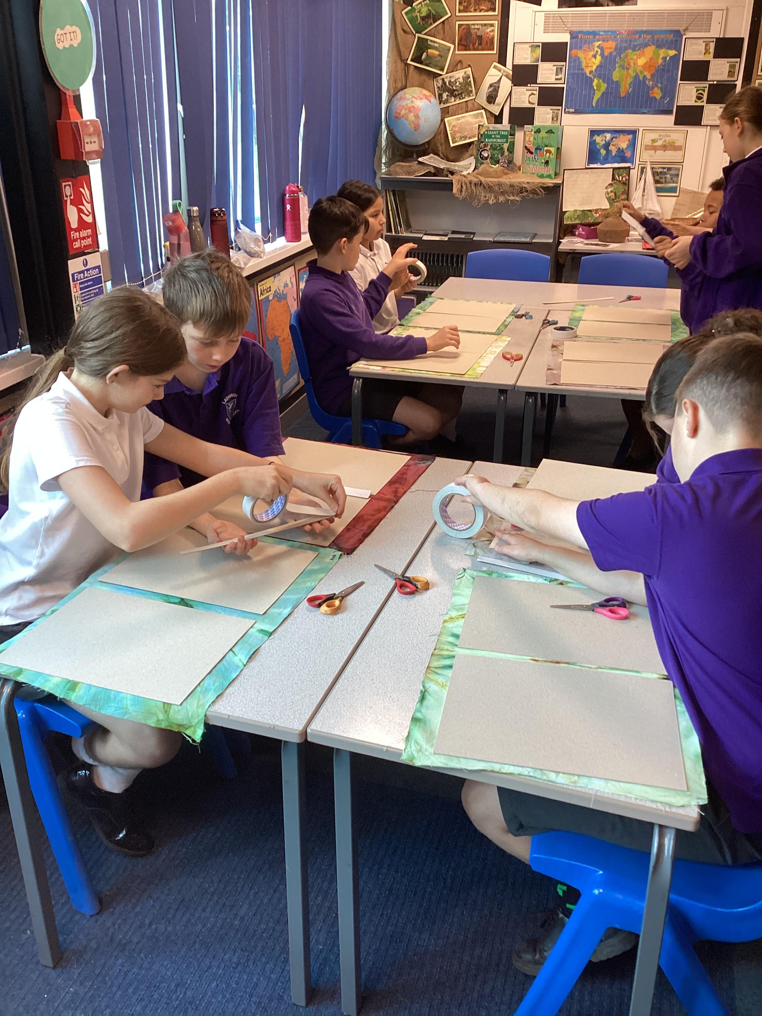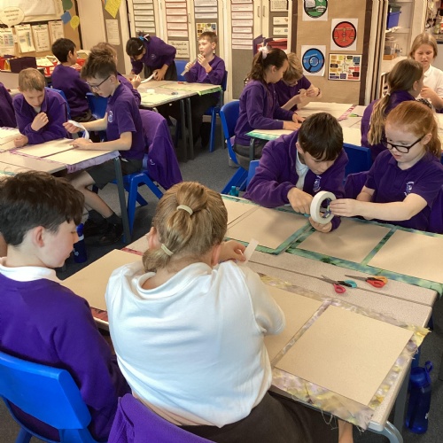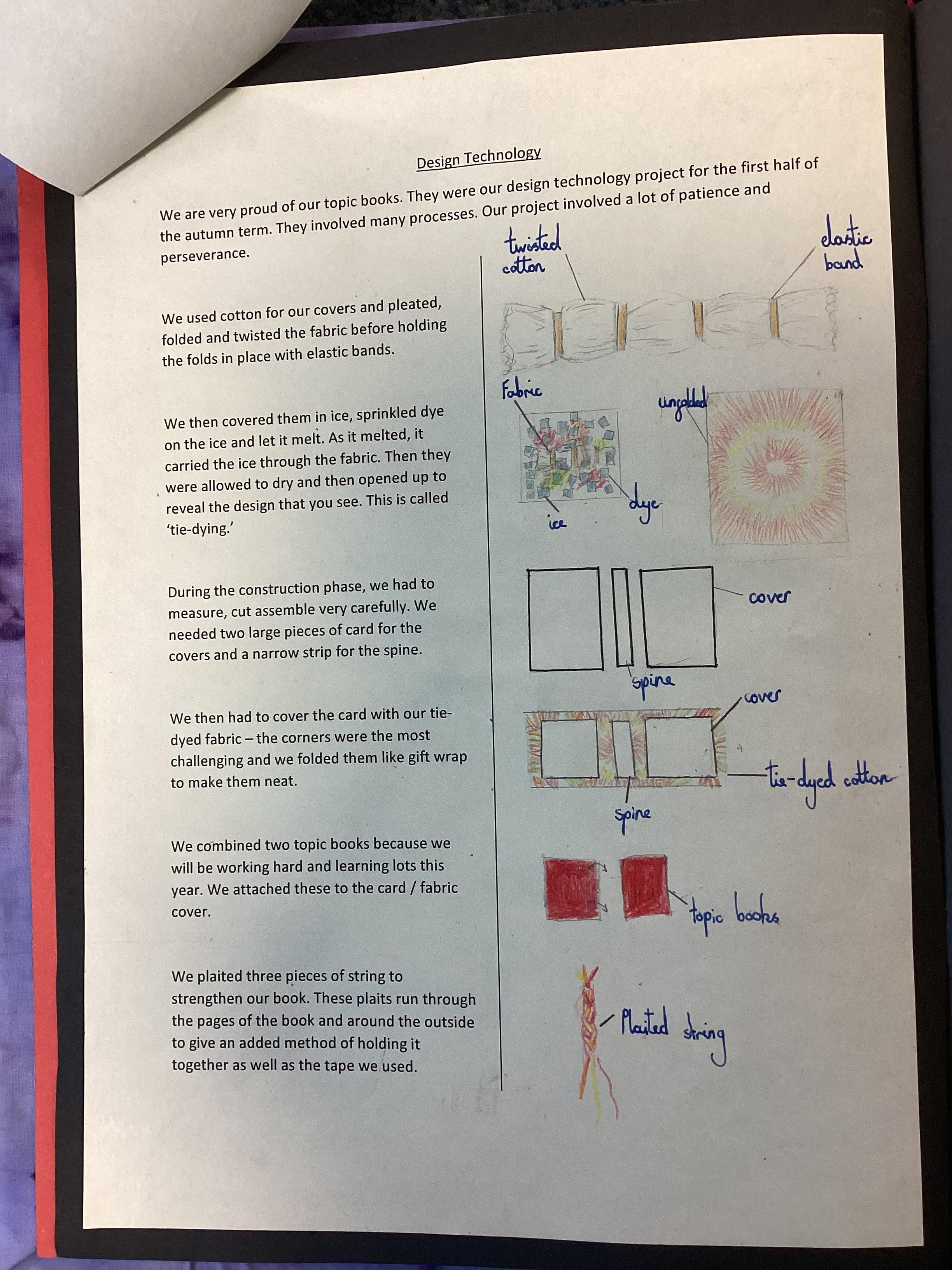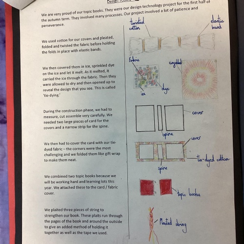 In DT, we created our beautiful topic books. We used tie-dying to create fabric covers and strengthened with cardboard. We decided our books would get quite heavy during the year as we collated our learning so we strengthened the spine further using plaited raffia. The finished products are really attractive but also durable for our needs.
