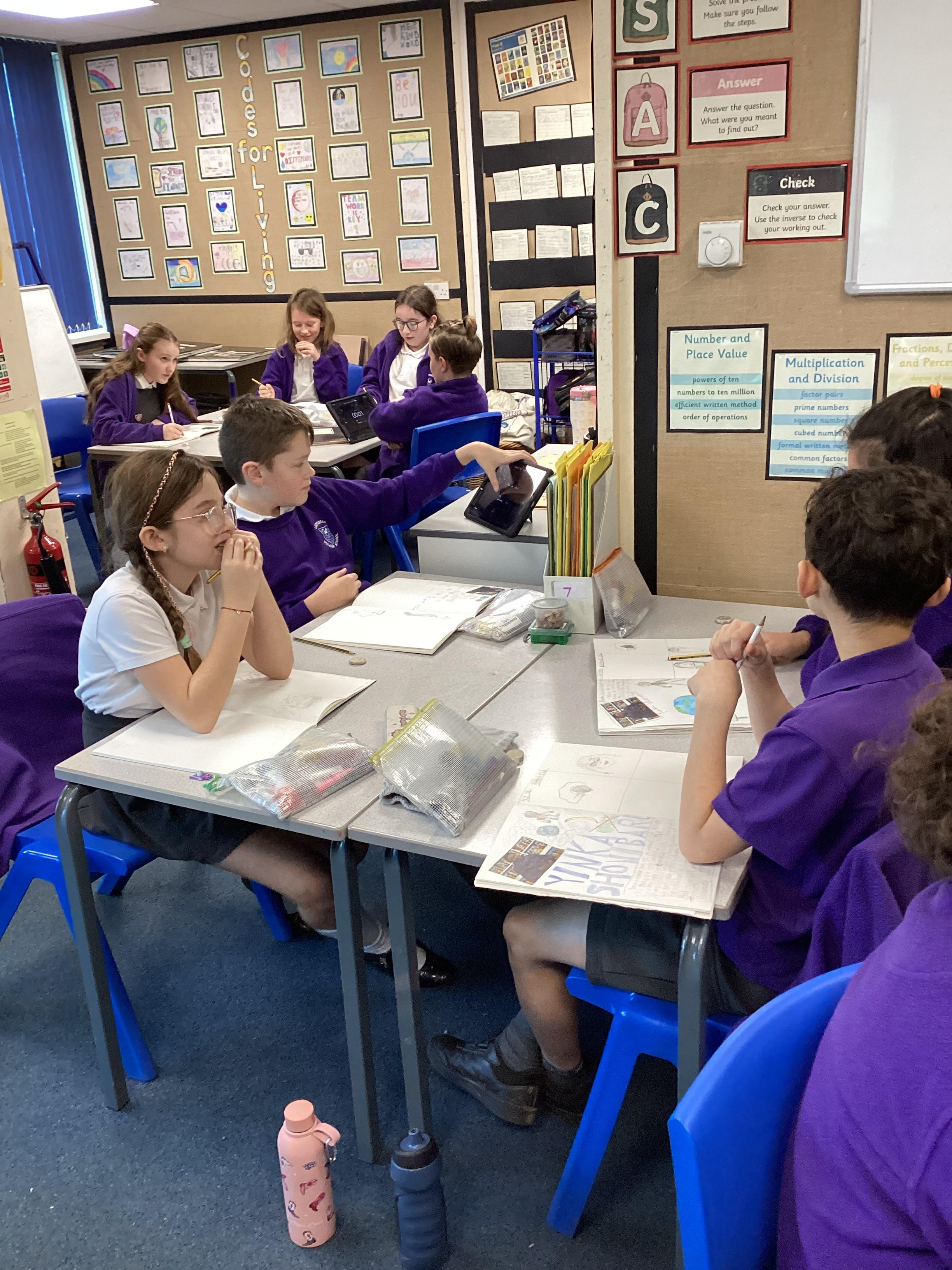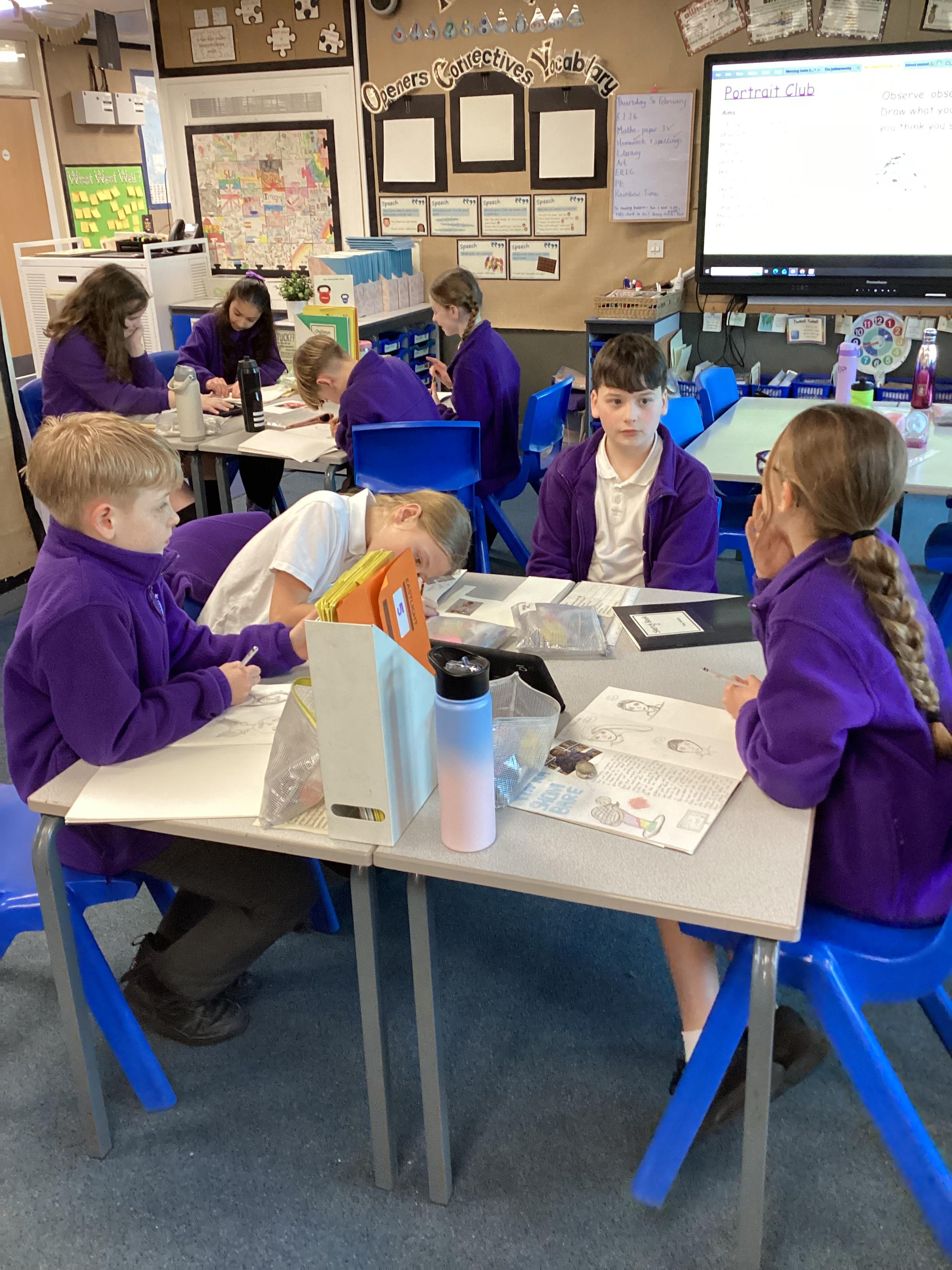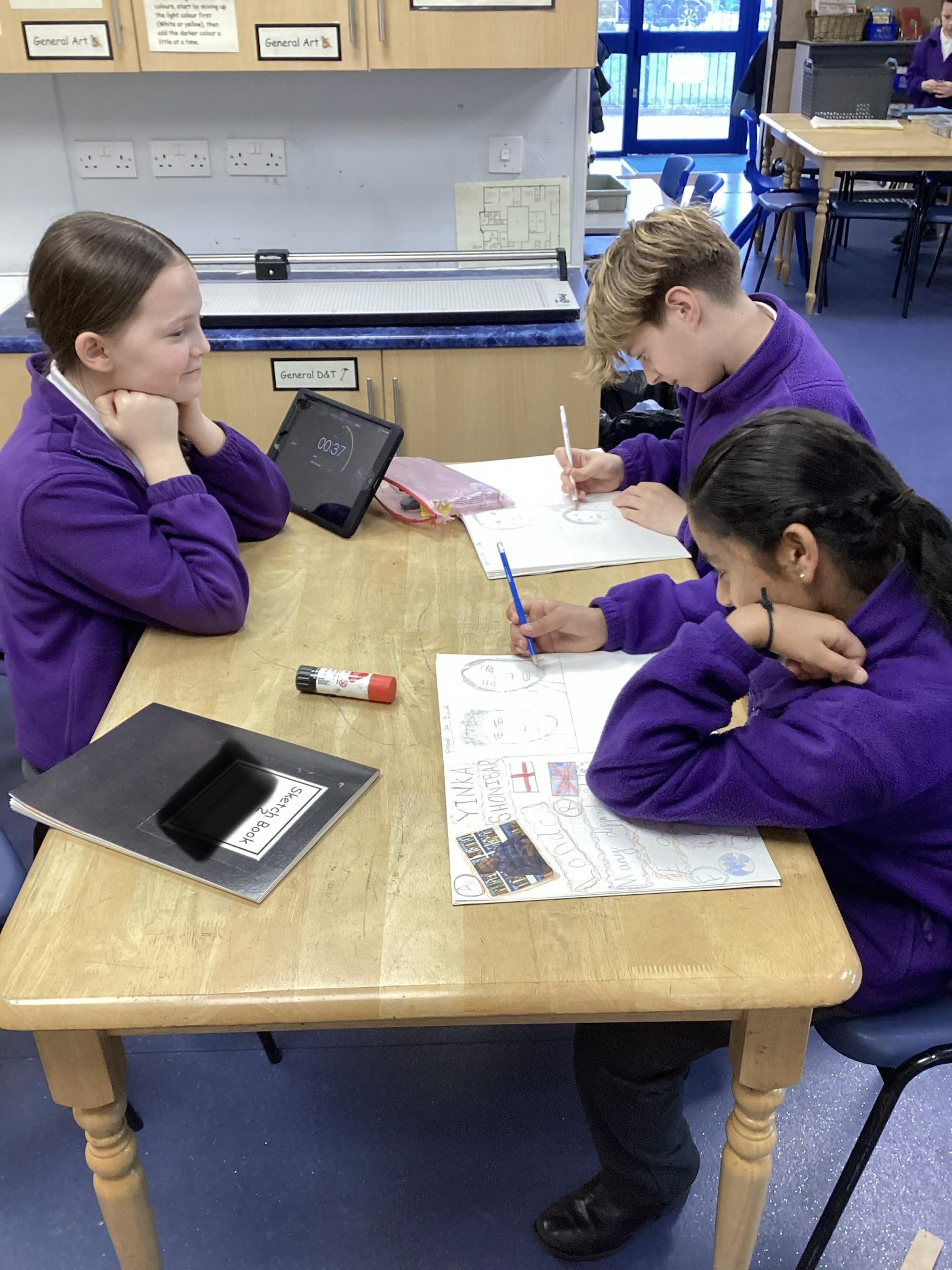 Our art unit is called Exploring Identity. So far we have researched the work of the artists Njideka Akunyili Crosby and Yinka Shonibare. We have created beautiful visual notes sharing what we have found out about their lives and how they express their identity through their artwork. Before we think about how we will portray our own identities through art, we have participated in several 'portrait club' sessions- a really fun way to bring portraiture to the classroom! The first rule is that everyone must take a turn at being a model and the second is to observe, observe, observe!