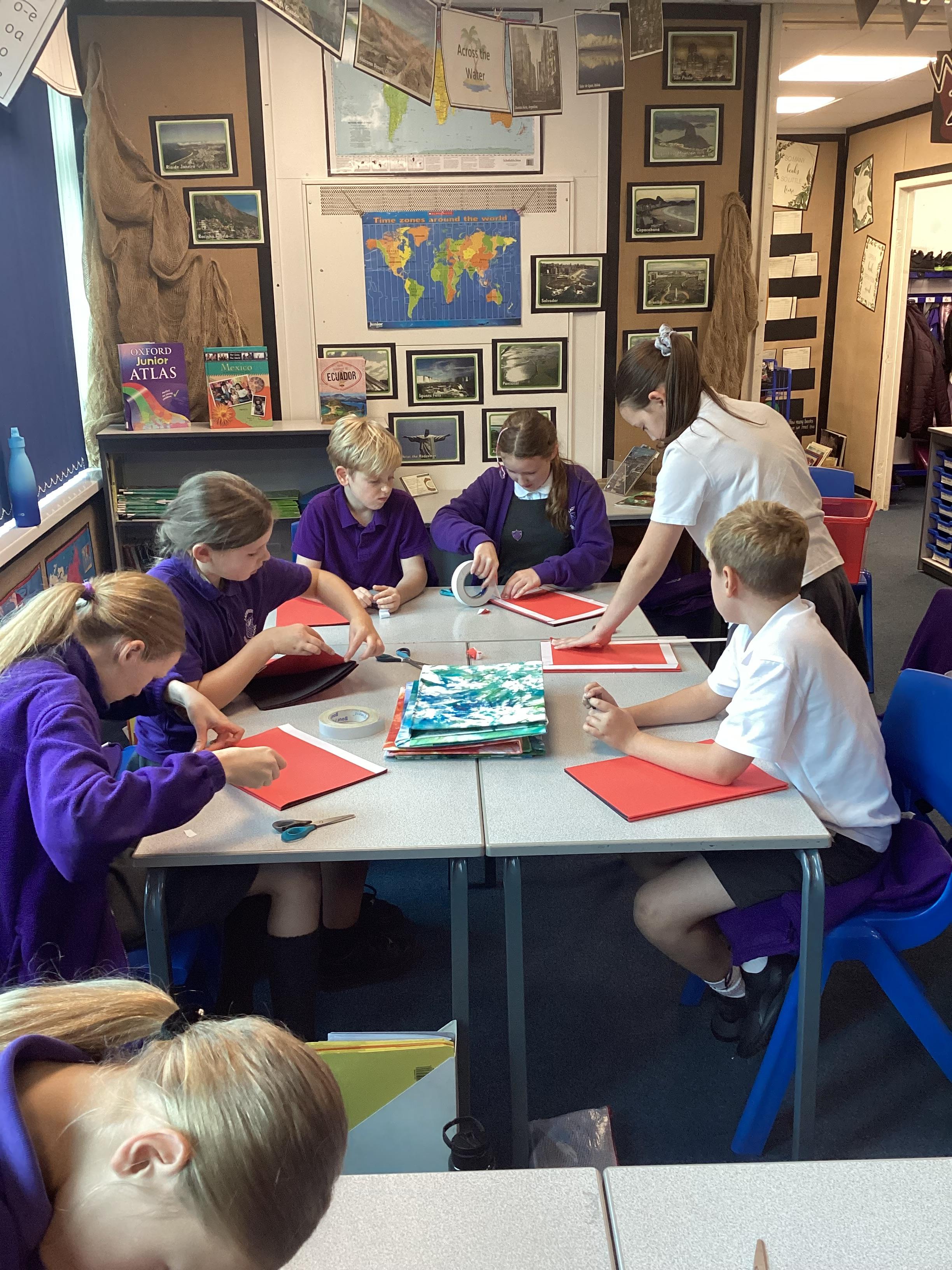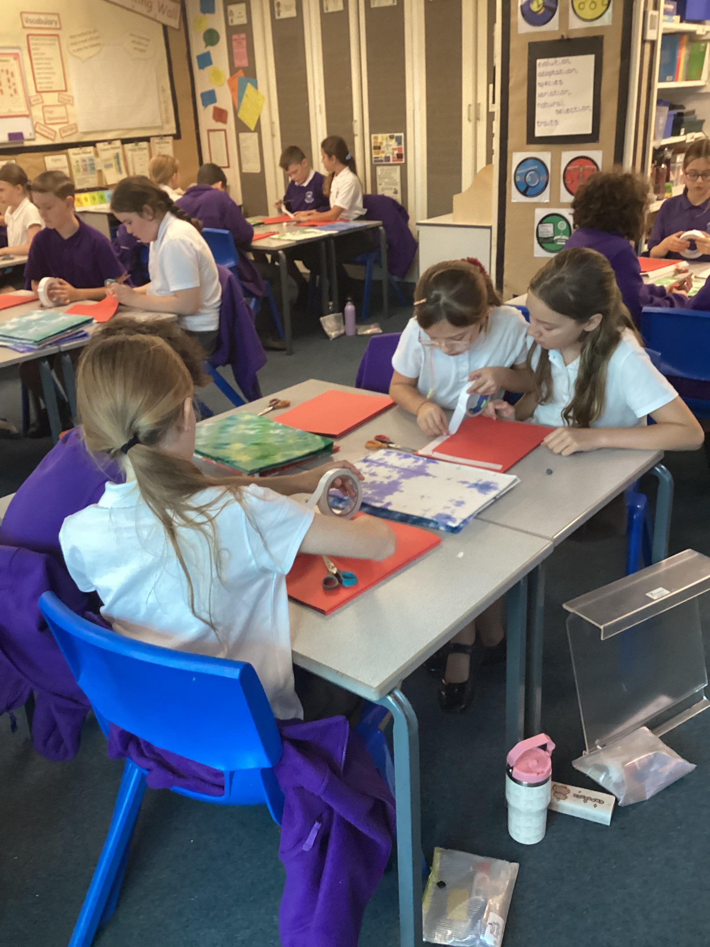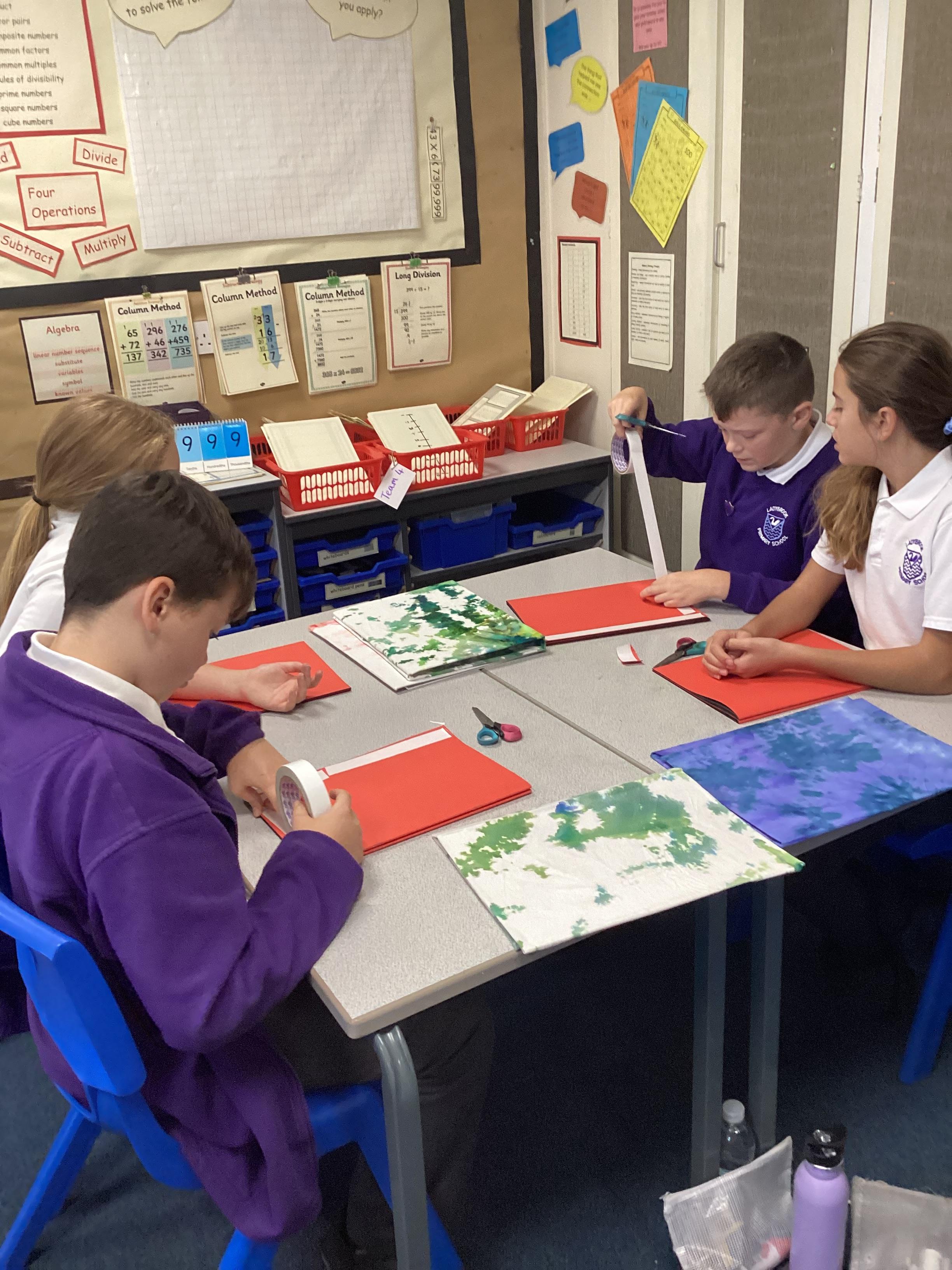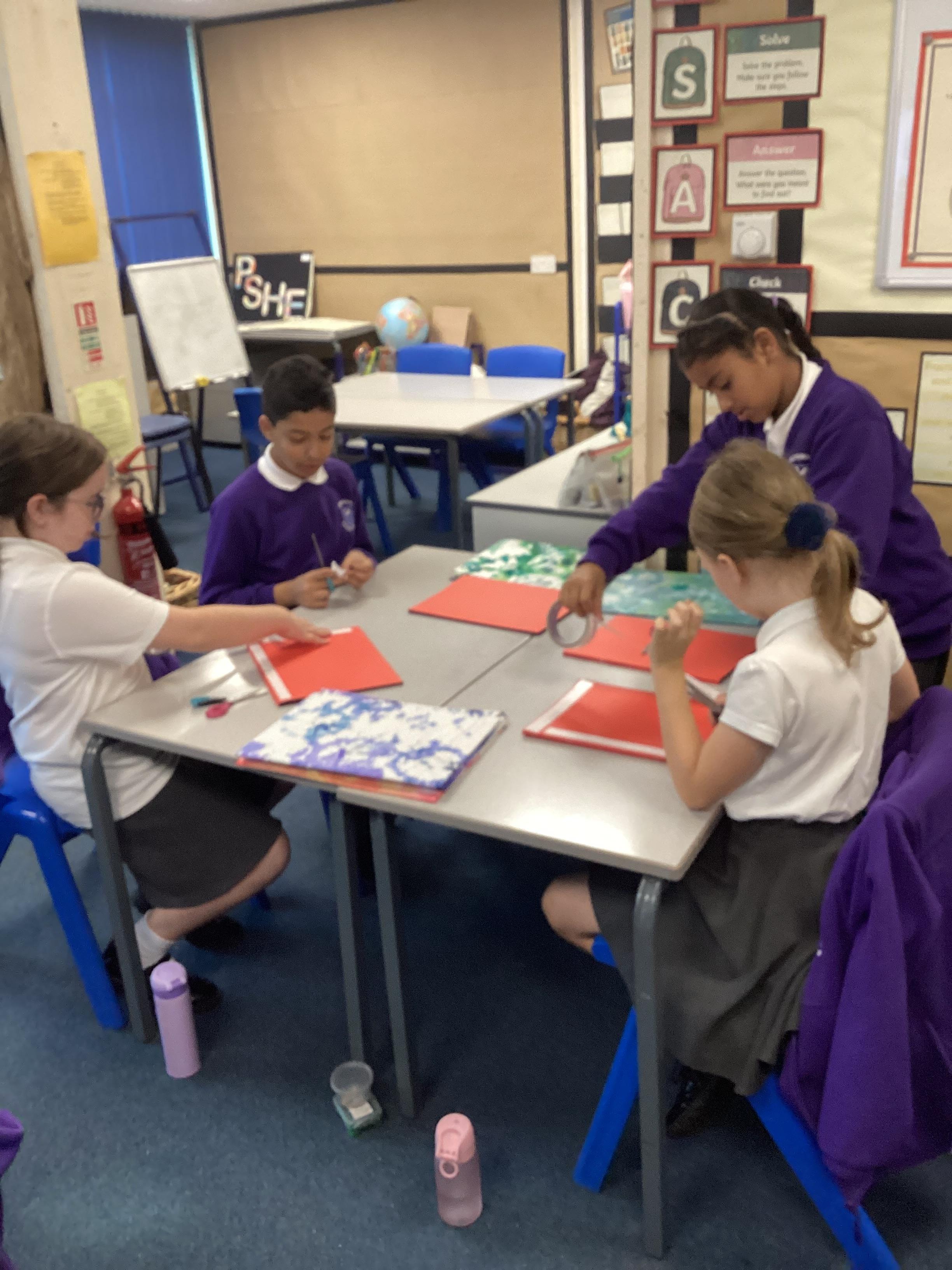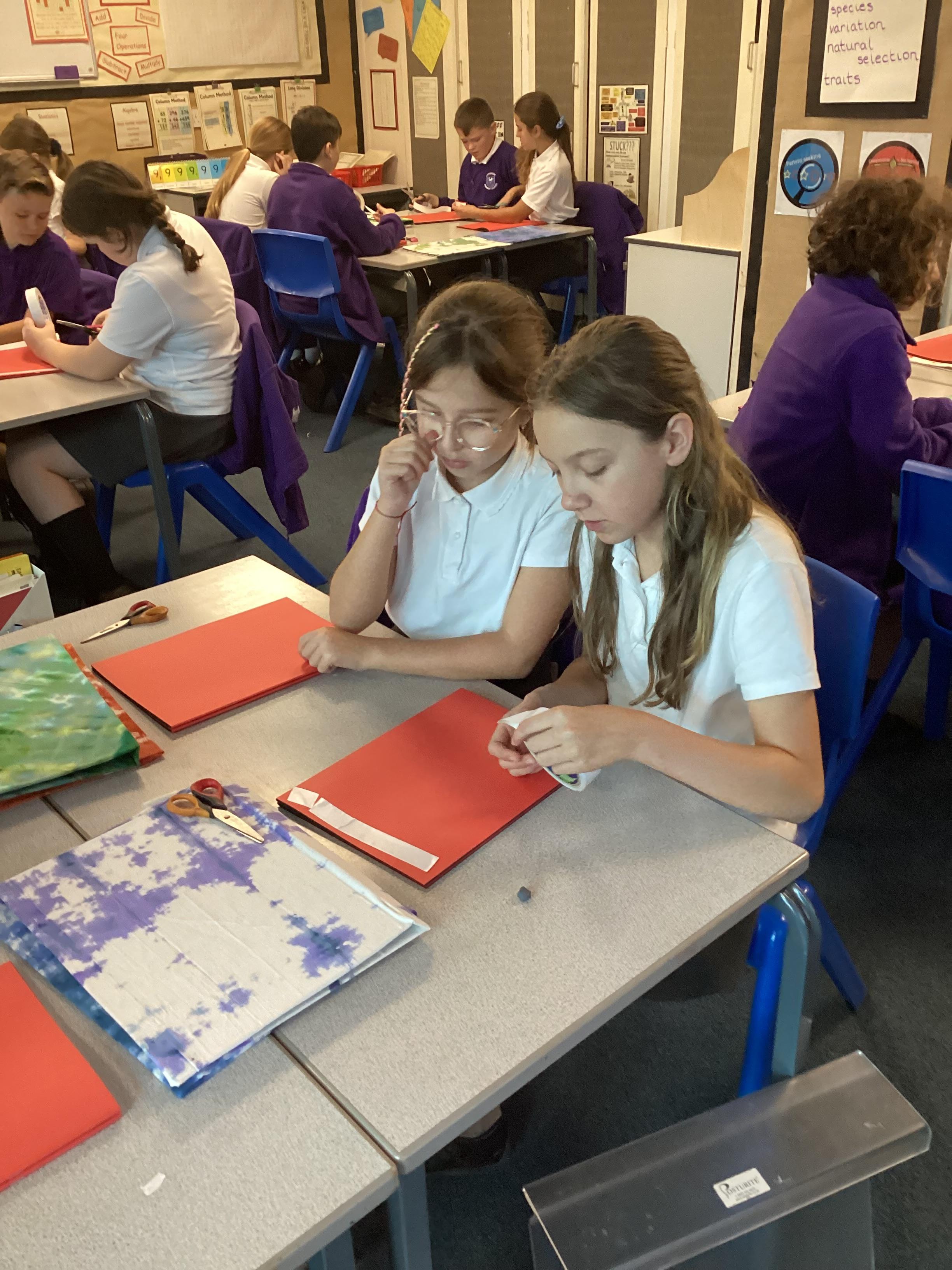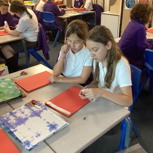 We are very proud of the topic books that we have made in Year 6. They were our design technology project for the first half of the autumn term. They involved many processes. Our project involved a lot of patience and perseverance. Here we are covering the card covers with our tie-dyed fabric – the corners were the most challenging and we folded them like gift wrap to make them neat.