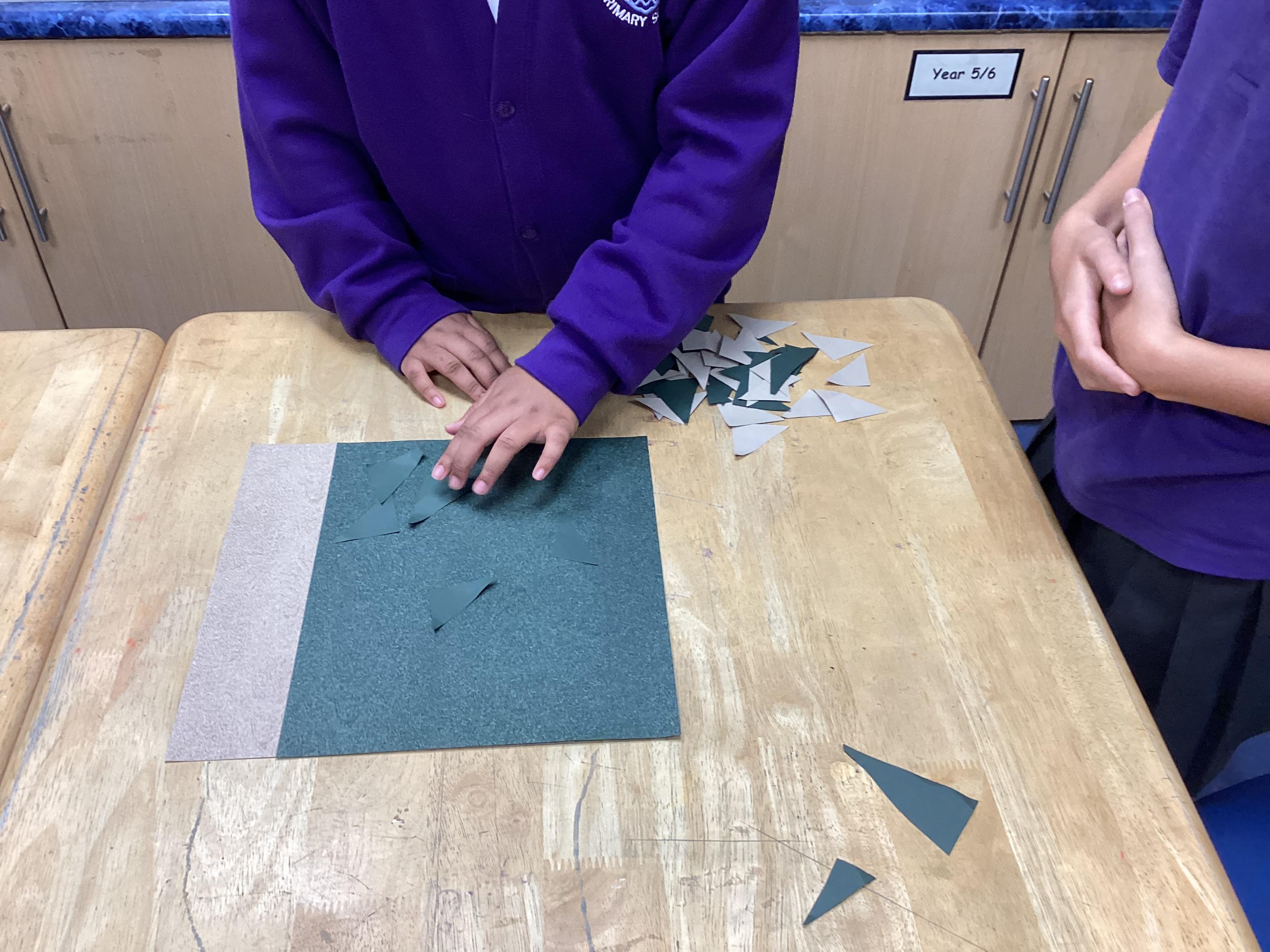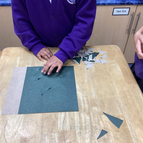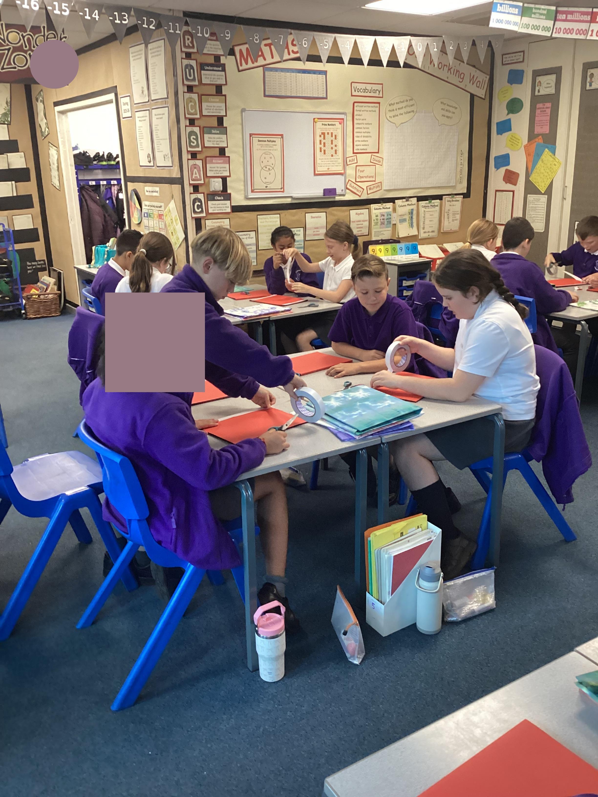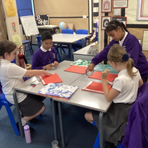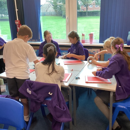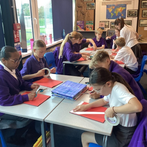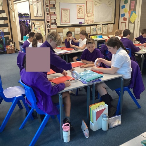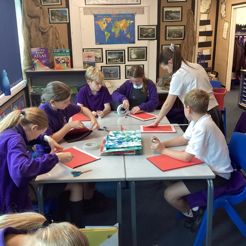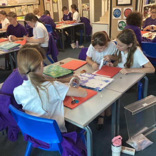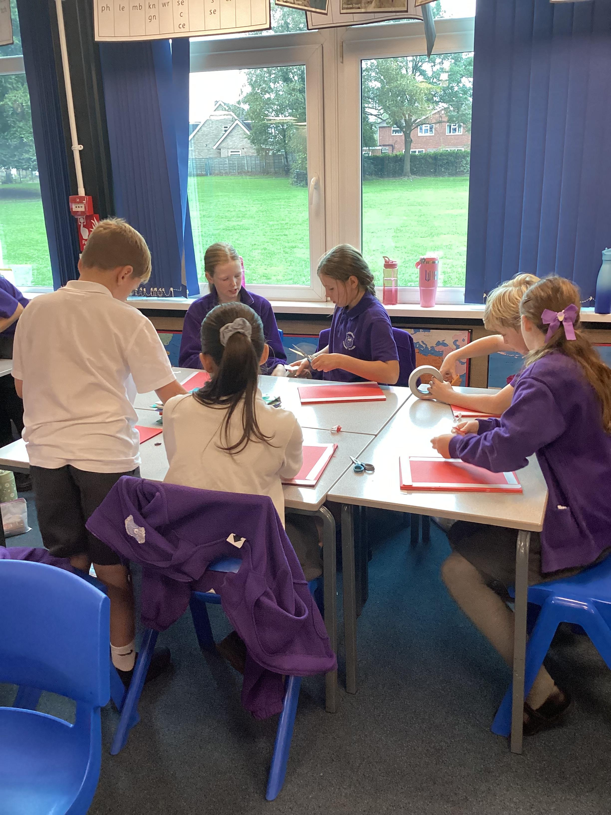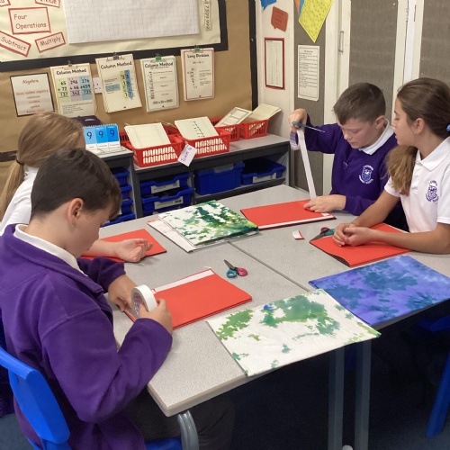 We are very proud of the topic books that we have made in Year 6. They were our design technology project for the first half of the autumn term. They involved many processes. Our project involved a lot of patience and perseverance. Here we are covering the card covers with our tie-dyed fabric – the corners were the most challenging and we folded them like gift wrap to make them neat.