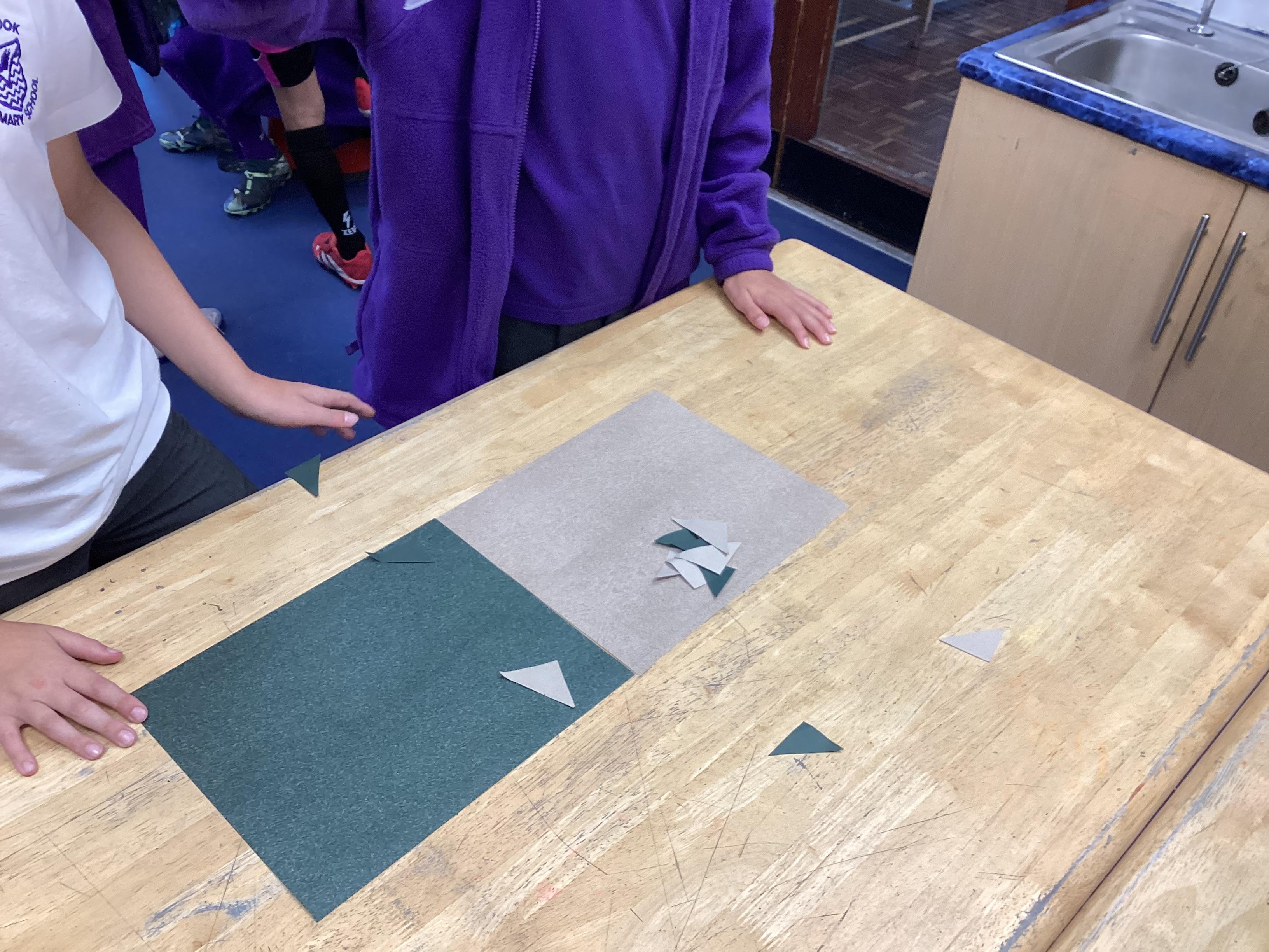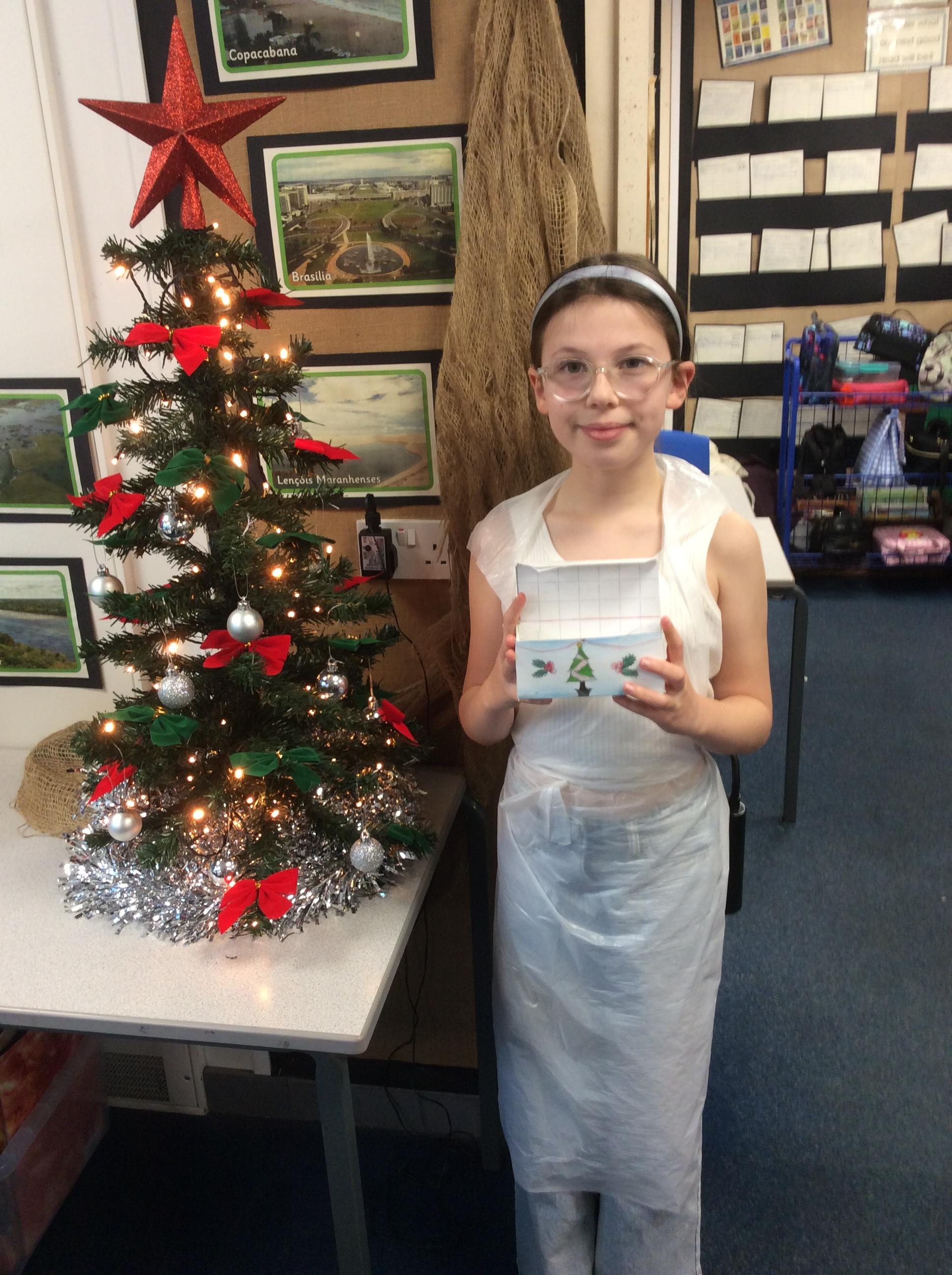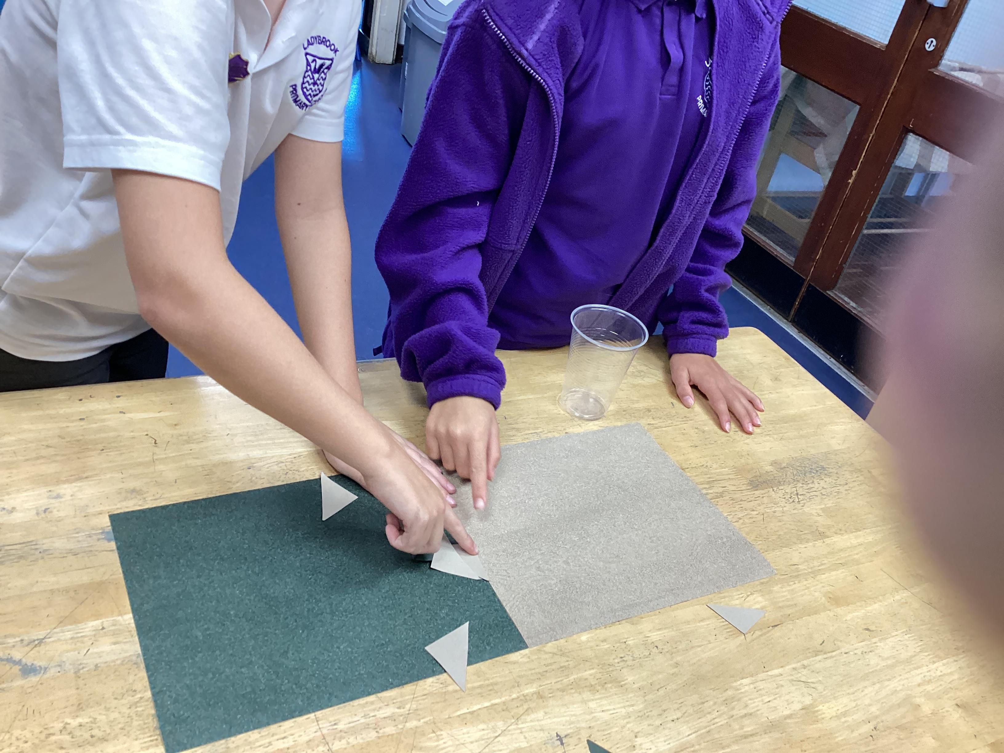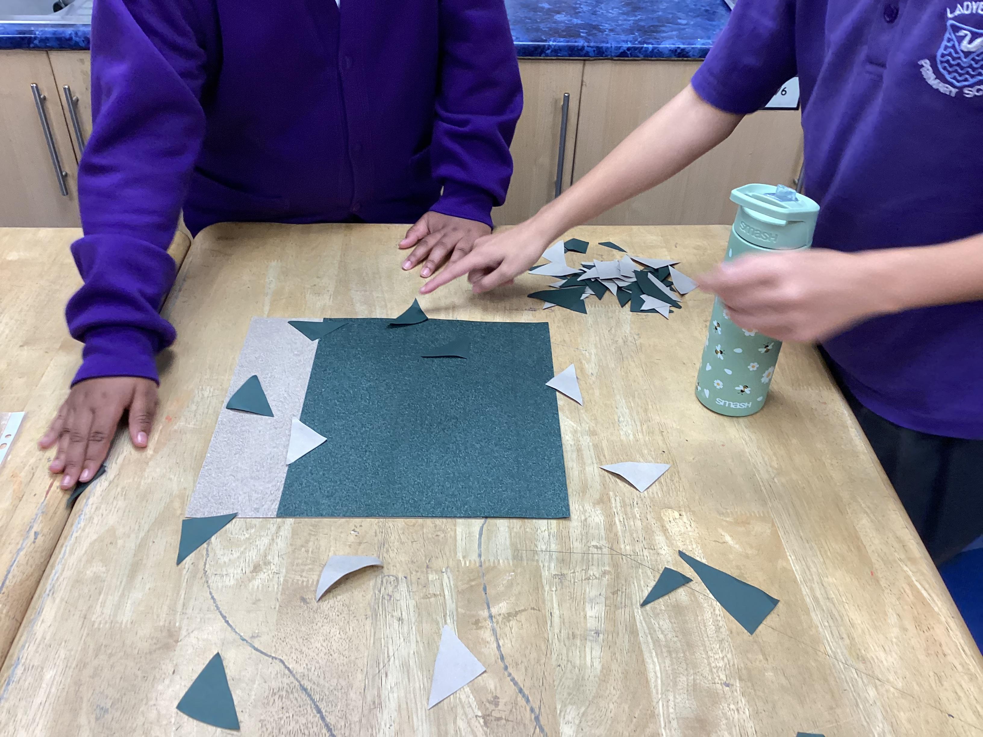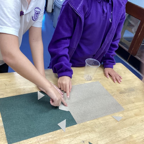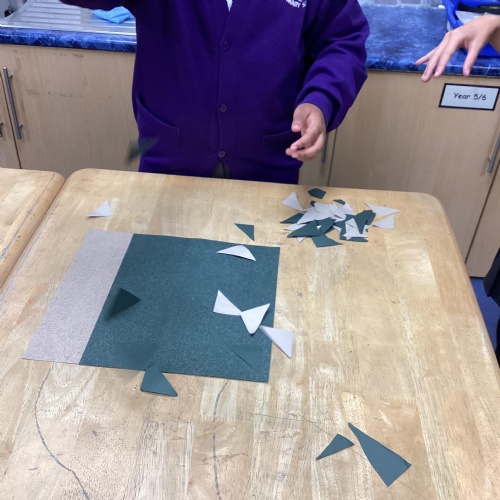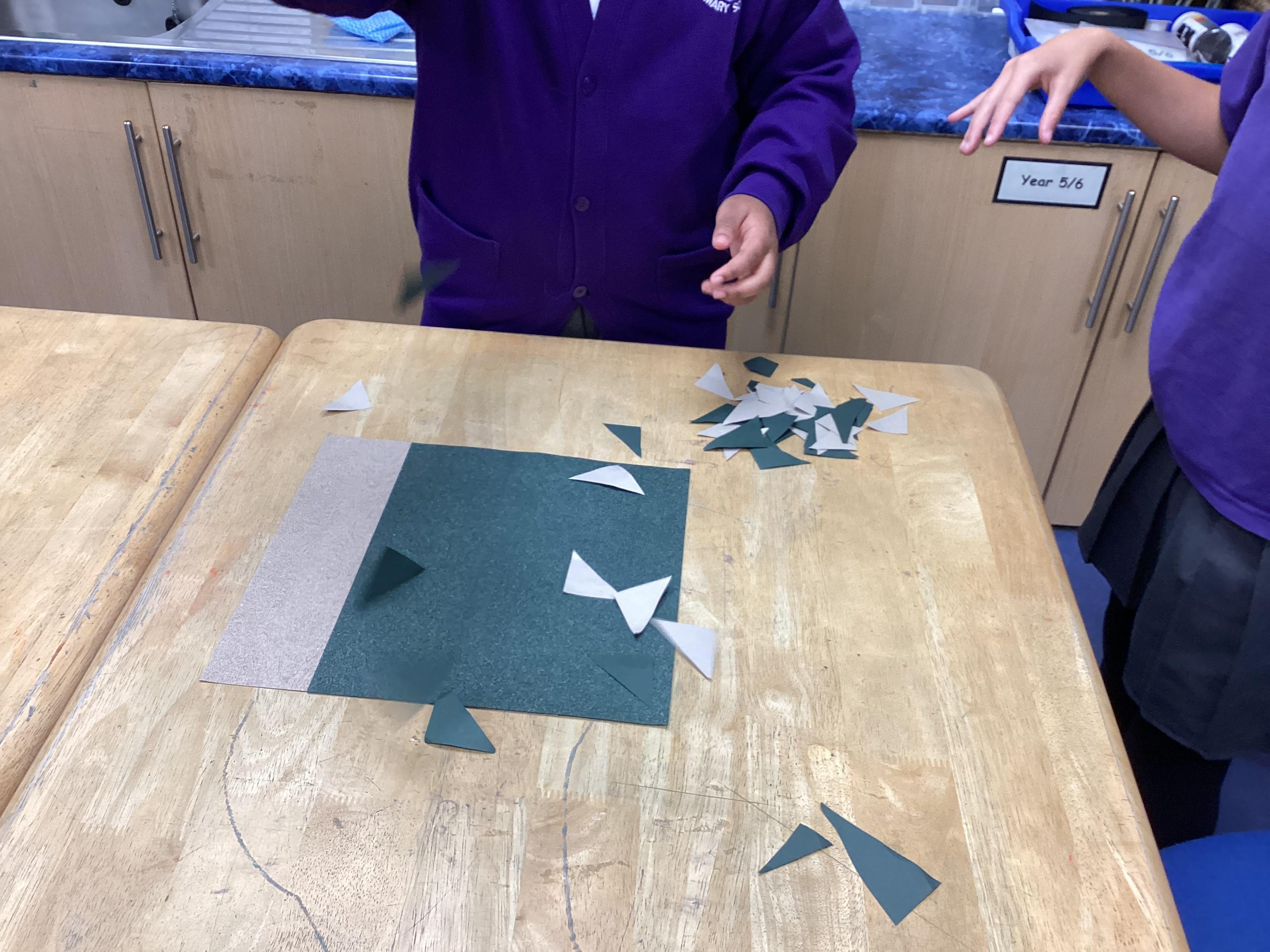 We are very proud of the topic books that we have made in Year 6. They were our design technology project for the first half of the autumn term. They involved many processes. Our project involved a lot of patience and perseverance. Here we are covering the card covers with our tie-dyed fabric – the corners were the most challenging and we folded them like gift wrap to make them neat.